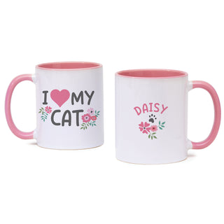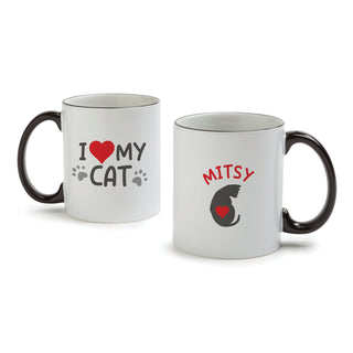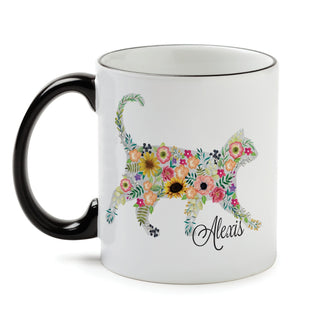 Floral Feline White Coffee Mug with Black Rim and Handle - 11oz
