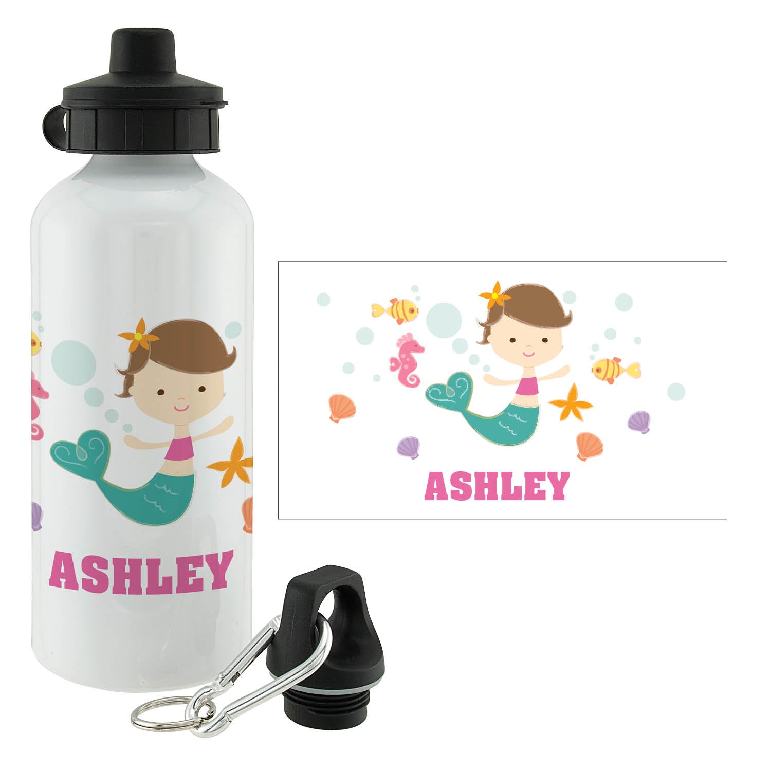 Our exclusive design features an adorable mermaid and any name at the bottom in pink text.