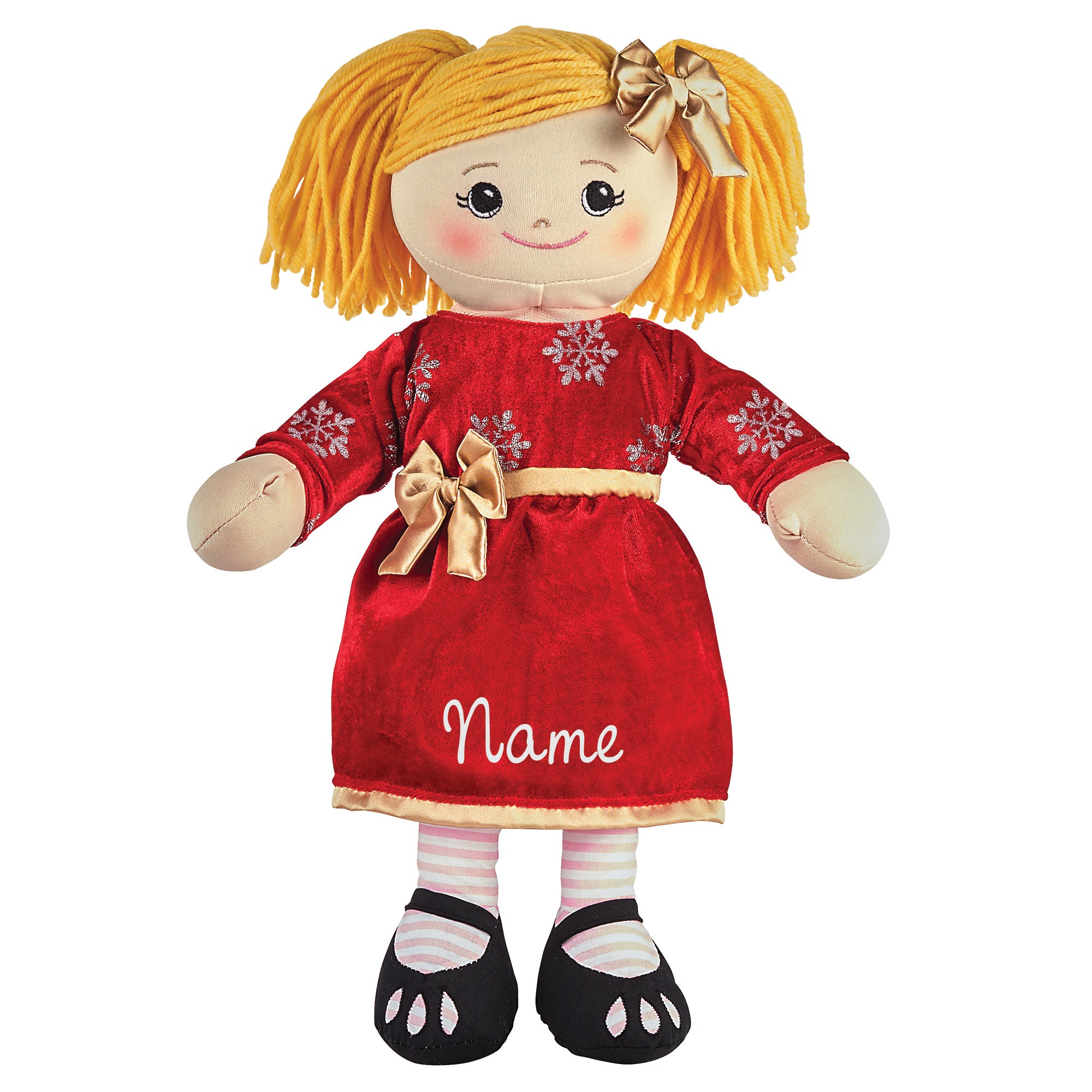 Delight your little one with our charming and huggable Personalized Rag Doll, dressed in a luxurious red velvet dress adorned with gold satin accents and a silver toned snowflake pattern. This cuddly companion is crafted with delicate embroidered facial features, fair skin and vibrant blonde hair tied in a classic pigtail style. Soft and huggable, this rag doll is a timeless gift perfect for playtime or decorative piece to a sweet girl's room. What makes this doll truly special is the customization option – personalize with any 9 character name, making it a one-of-a-kind gift for birthdays, holidays, or special occasions.