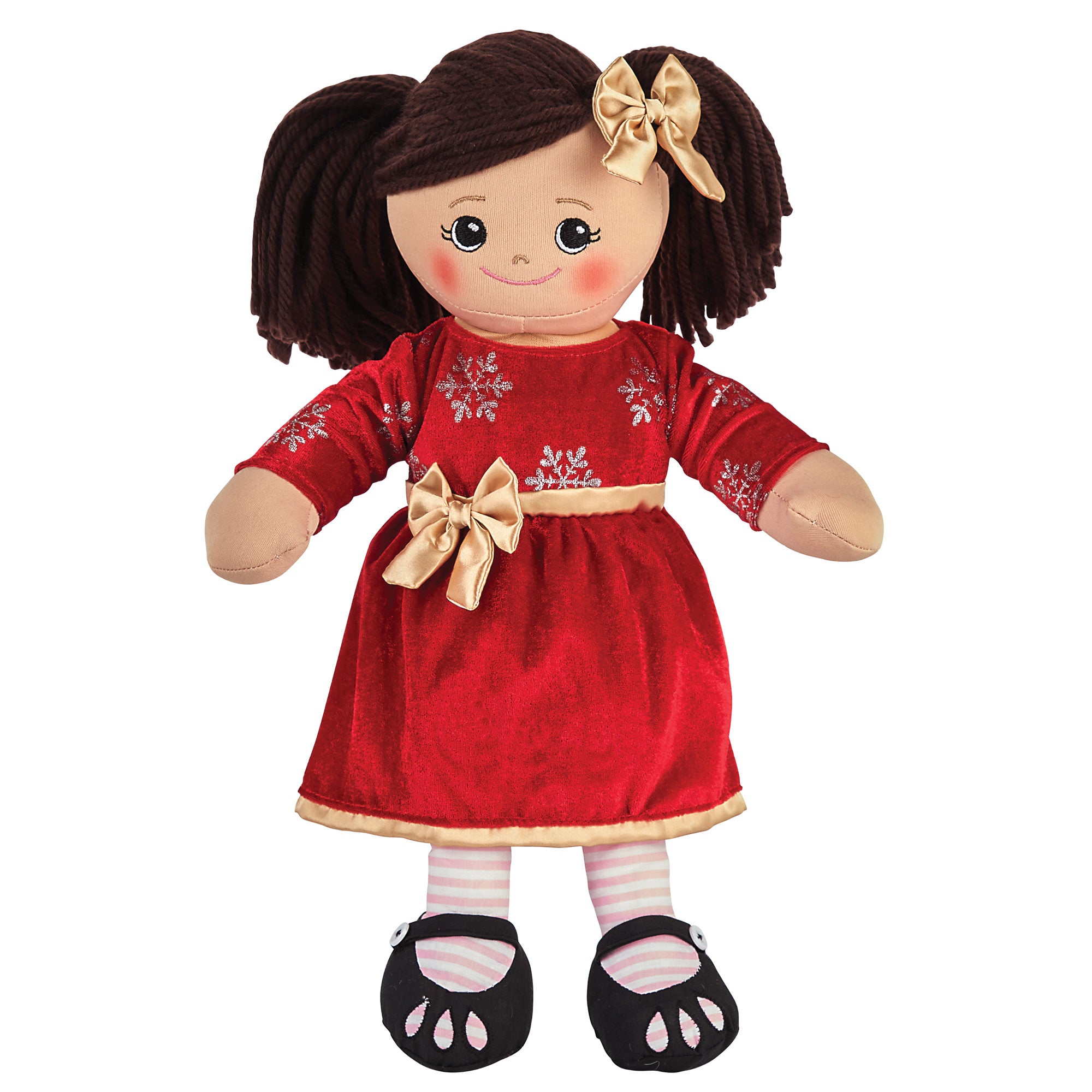 Delight your little one with our charming and huggable Personalized Rag Doll, dressed in a luxurious red velvet dress adorned with gold satin accents and a silver toned snowflake pattern. This cuddly companion is crafted with delicate embroidered facial features, medium skin tone and vibrant dark brown hair tied in a classic pigtail style. Soft and huggable, this rag doll is a timeless gift perfect for playtime or decorative piece to a sweet girl's room. What makes this doll truly special is the customization option – personalize with any 9 character name, making it a one-of-a-kind gift for birthdays, holidays, or special occasions.