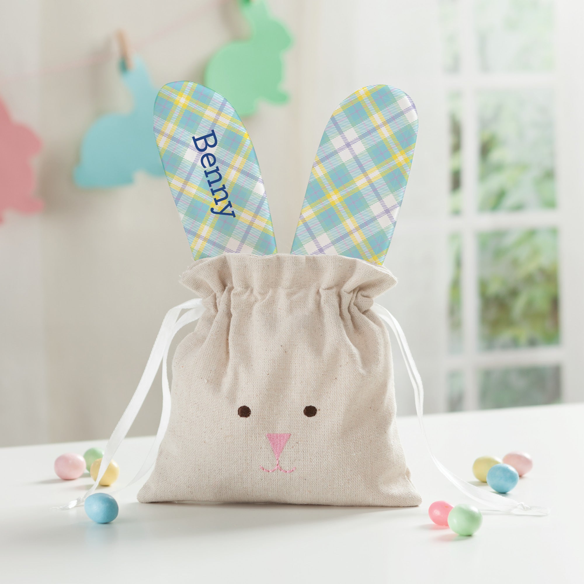 Surprise a special little one with a custom bunny pouch filled with Easter treats! Perfect for holding a small trinket or toy, this drawstring bag features teal plaid bunny ears sticking out the top and space to personalize with a name in vibrant blue. Makes a wonderful Easter gift idea when you personalize!