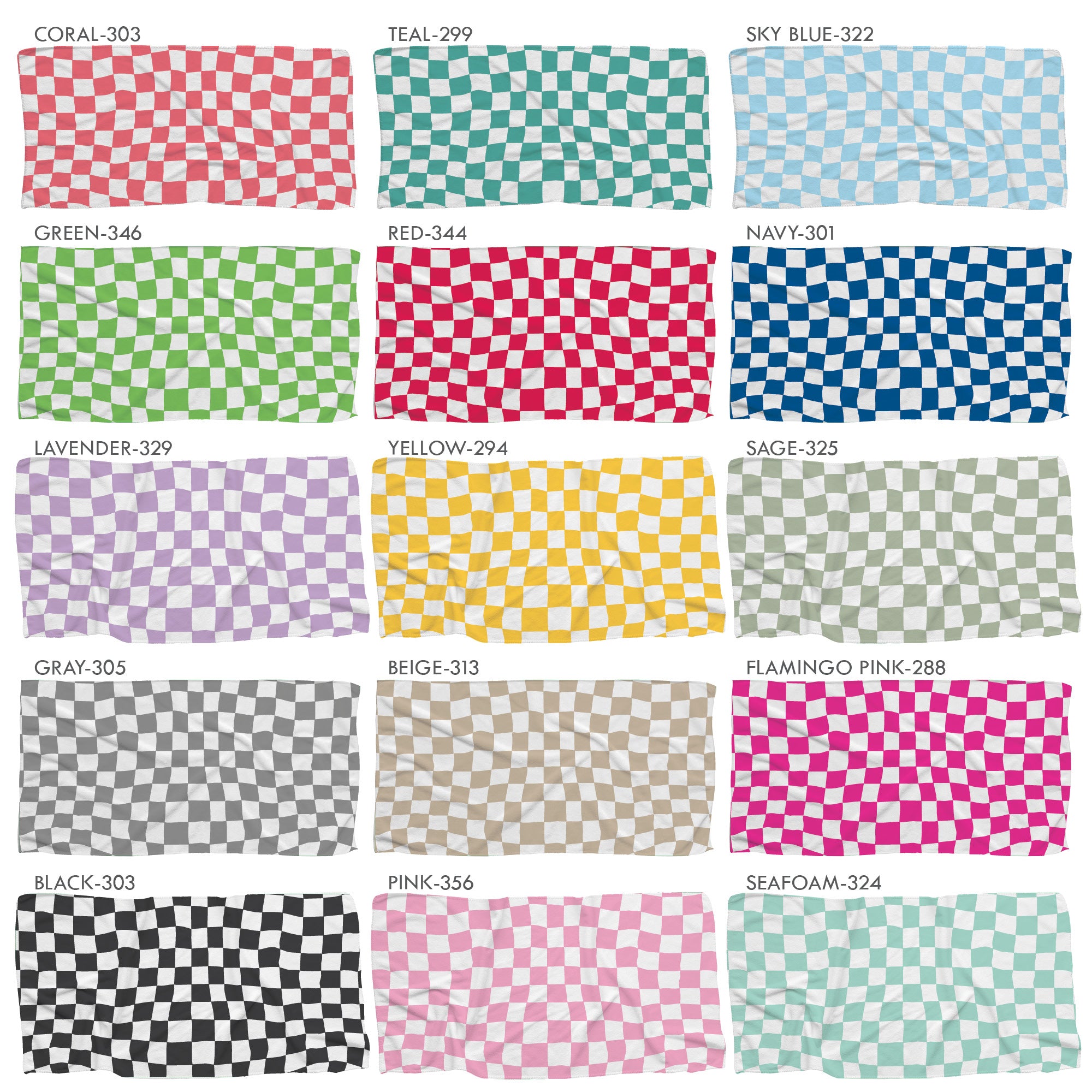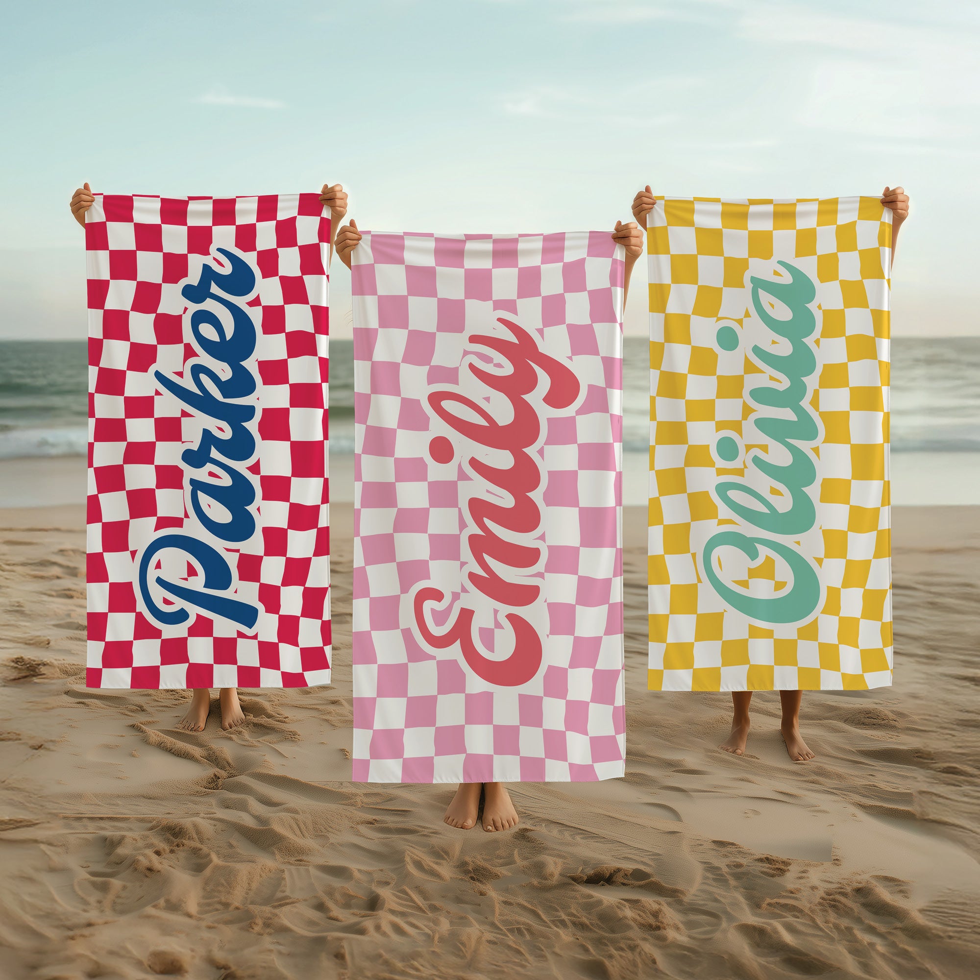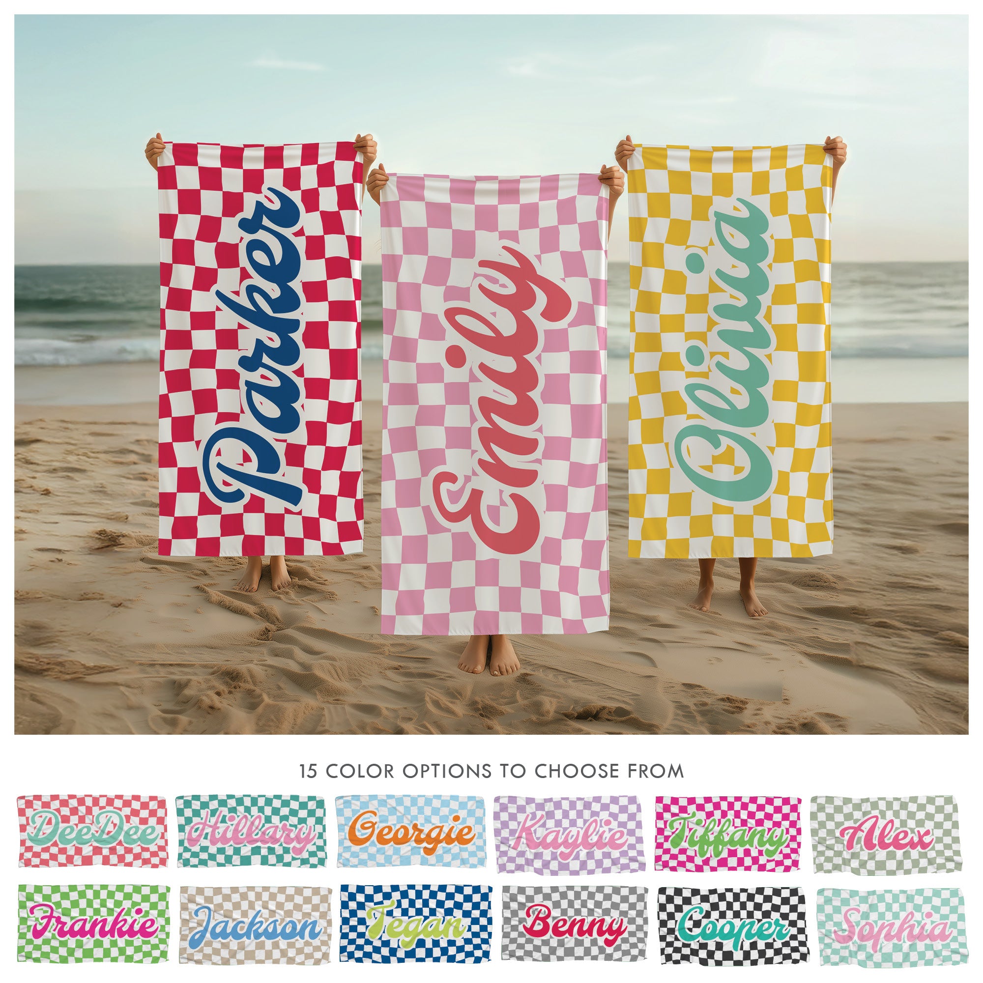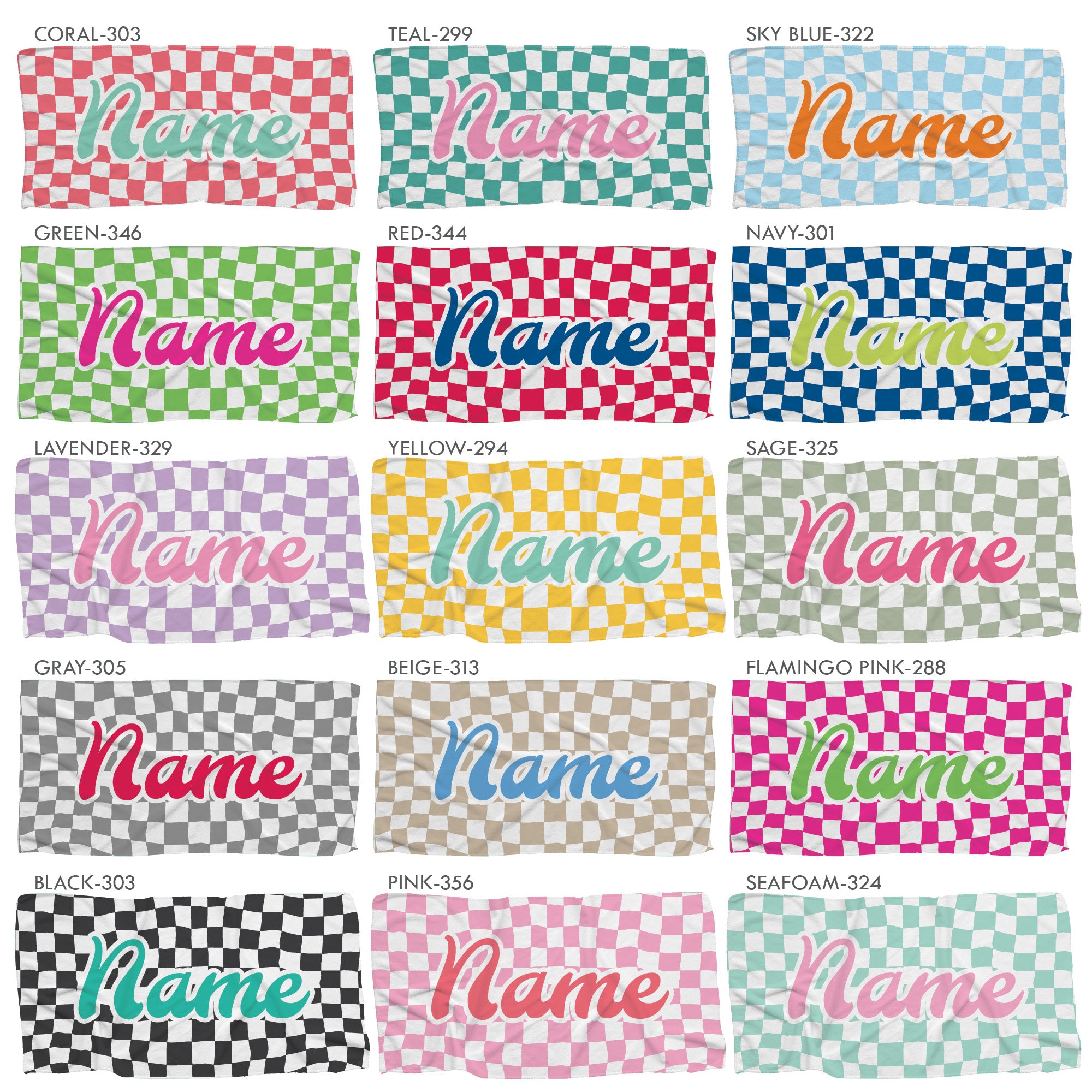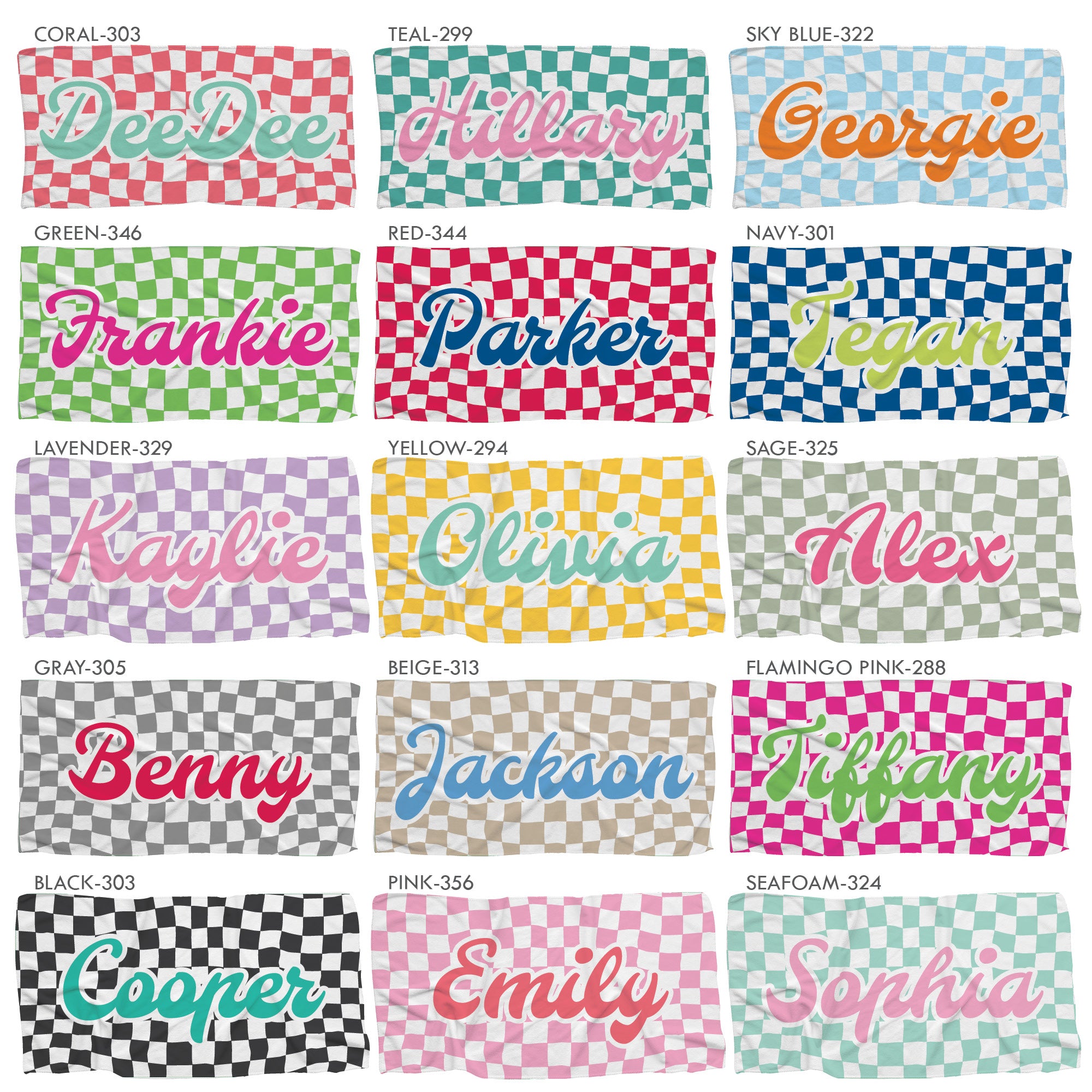 Head to the pool or beach in custom style with this retro-inspired beach towel! Featuring playful script and a trendy checkered pattern in a variety of bold and pastel shades, it’s the perfect way to stand out. With 15 color options to choose from, this is a perfect gift for large groups! Personalize it for summer camp, vacations, or weekend getaways.