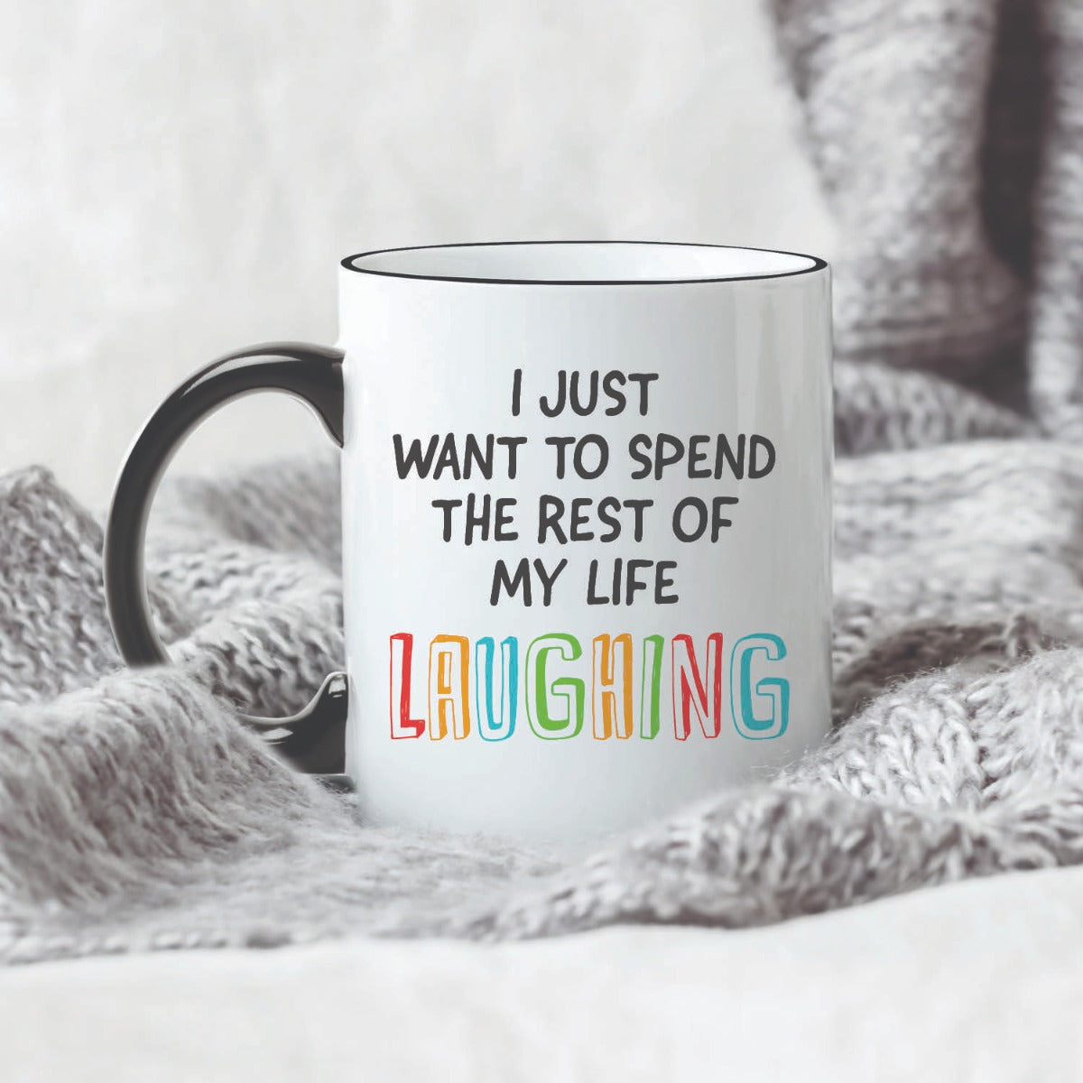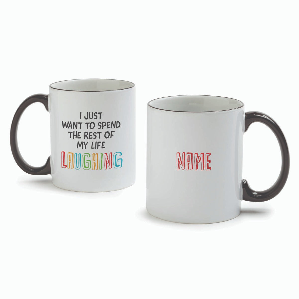 Express yourself with this lovely coffee mug you can customize! Unique and colorful, this mug features the message, "I just want to spend the rest of my life laughing" with "laughing" in rainbow-colored lettering. Give your morning coffee signature flair when you personalize the back with a name in bright-red! Personalization will appear in all uppercase letters.