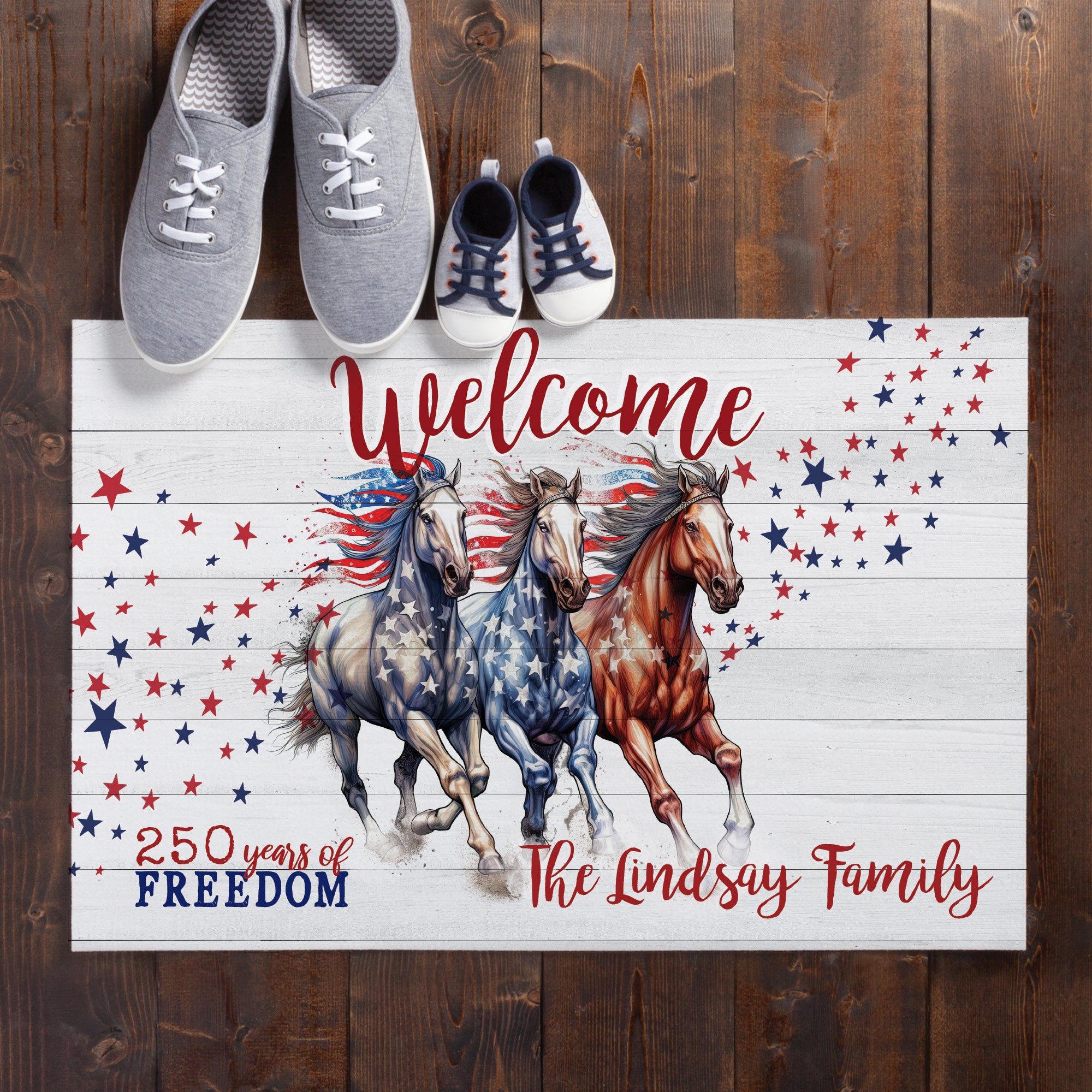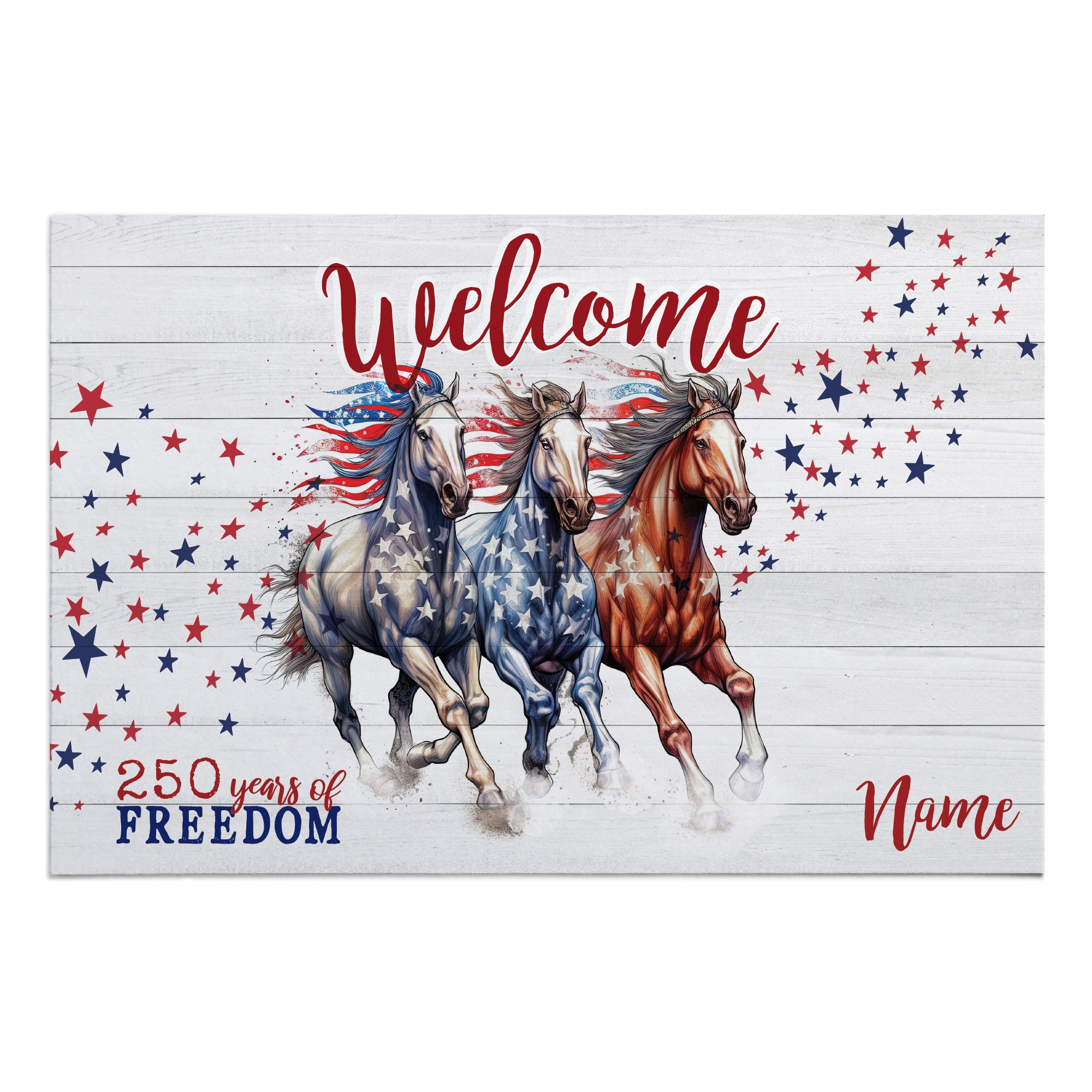 Make a statement before guests even step inside with the Freedom Blazing Horse Doormat. Measuring 18x27 inches and 1/8" thin, this durable welcome mat features blazing horse graphics in patriotic red, white, and blue, celebrating freedom, strength, and equestrian spirit. Whether for yourself or as a thoughtful gift for horse lovers and patriots, this doormat combines functionality with eye-catching patriotic style.