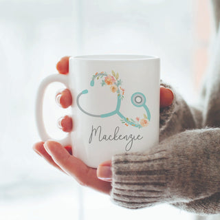 Floral Stethoscope Personalized White Coffee Mug - 11 oz.