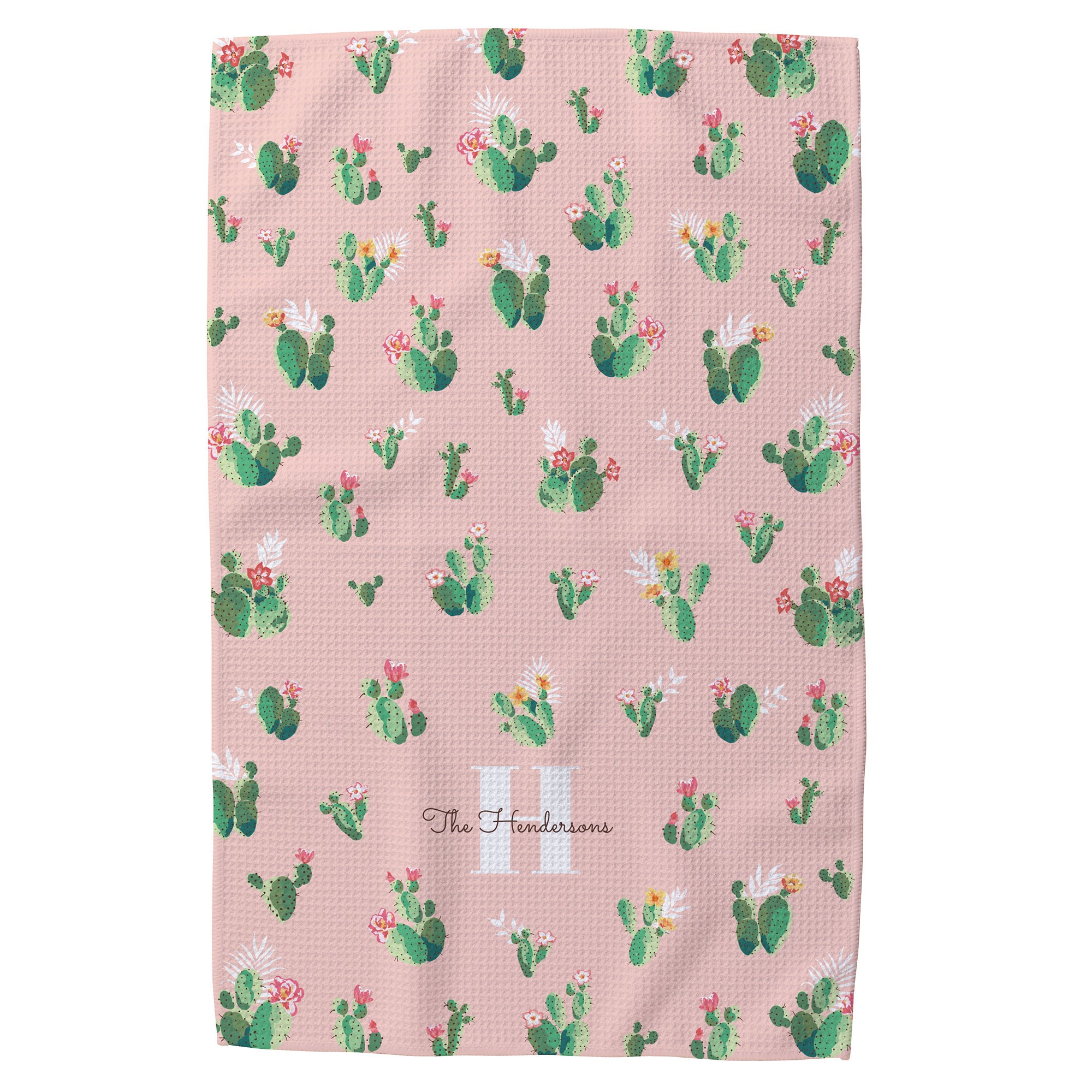 Add a touch of desert charm to your kitchen with this Floral Cactus Pattern Waffle Tea Towel. Featuring soft pink and fresh green hues, the playful cactus design is accented with delicate floral details for a look that's both cheerful and stylish. Personalize with a name and initial.