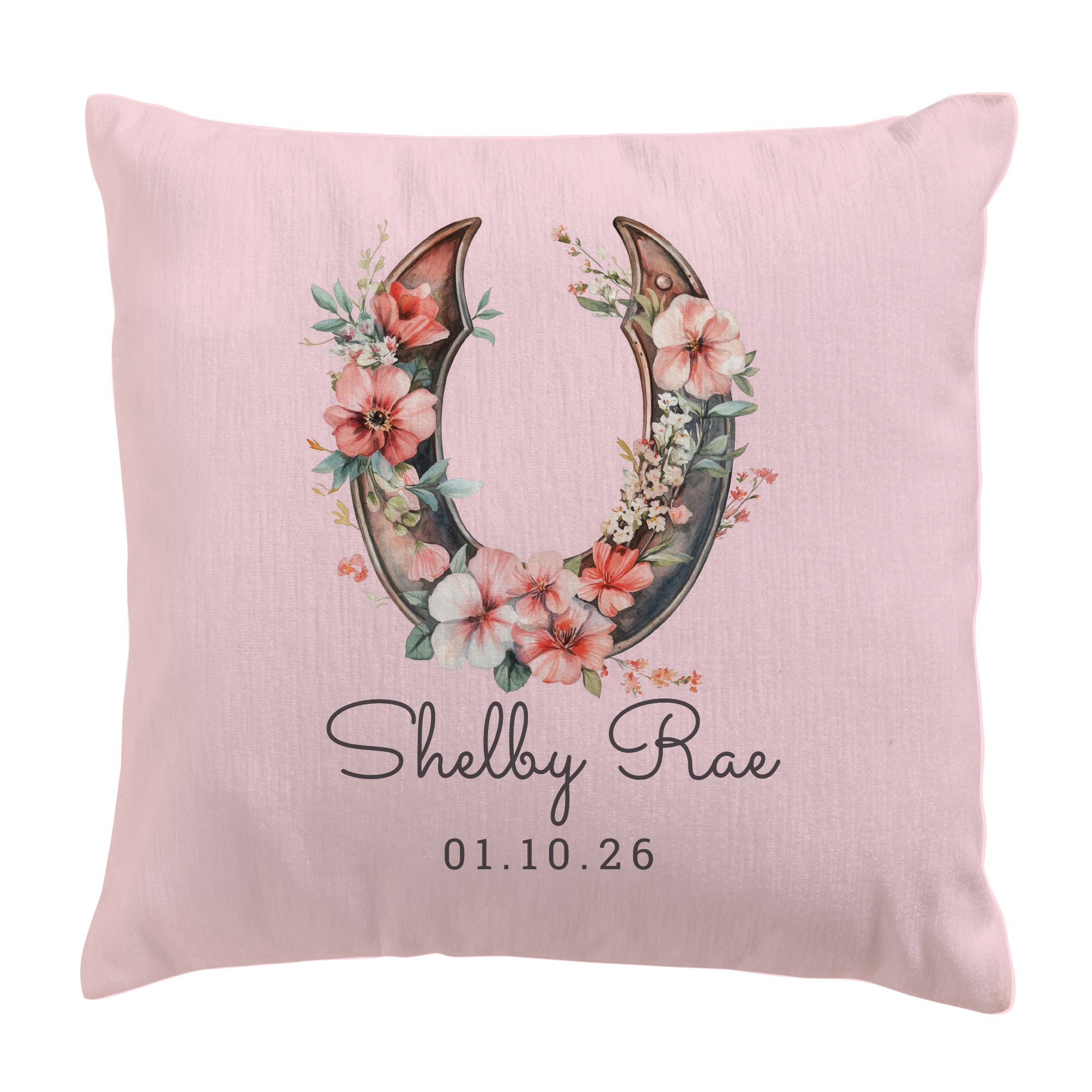 Bring a touch of luck and charm to your home décor with this Floral Horseshoe 17" Throw Pillow. Featuring a classic horseshoe design adorned with delicate florals, this pillow blends rustic Western spirit with soft, modern elegance. Perfect for sofas, beds, or accent chairs, its vibrant yet soothing colors add personality and warmth to any space. Personalize with a name and birthdate for a special gift idea.