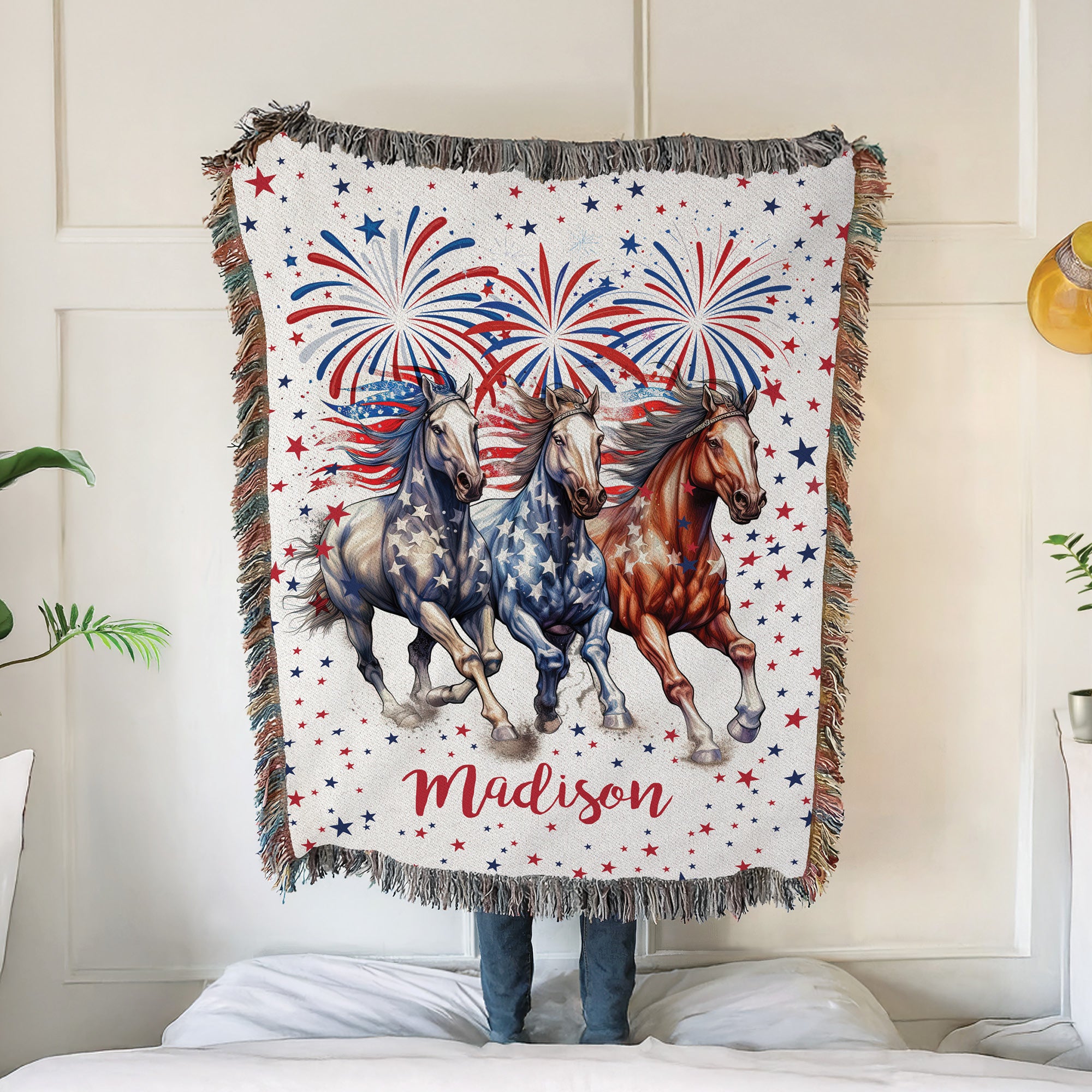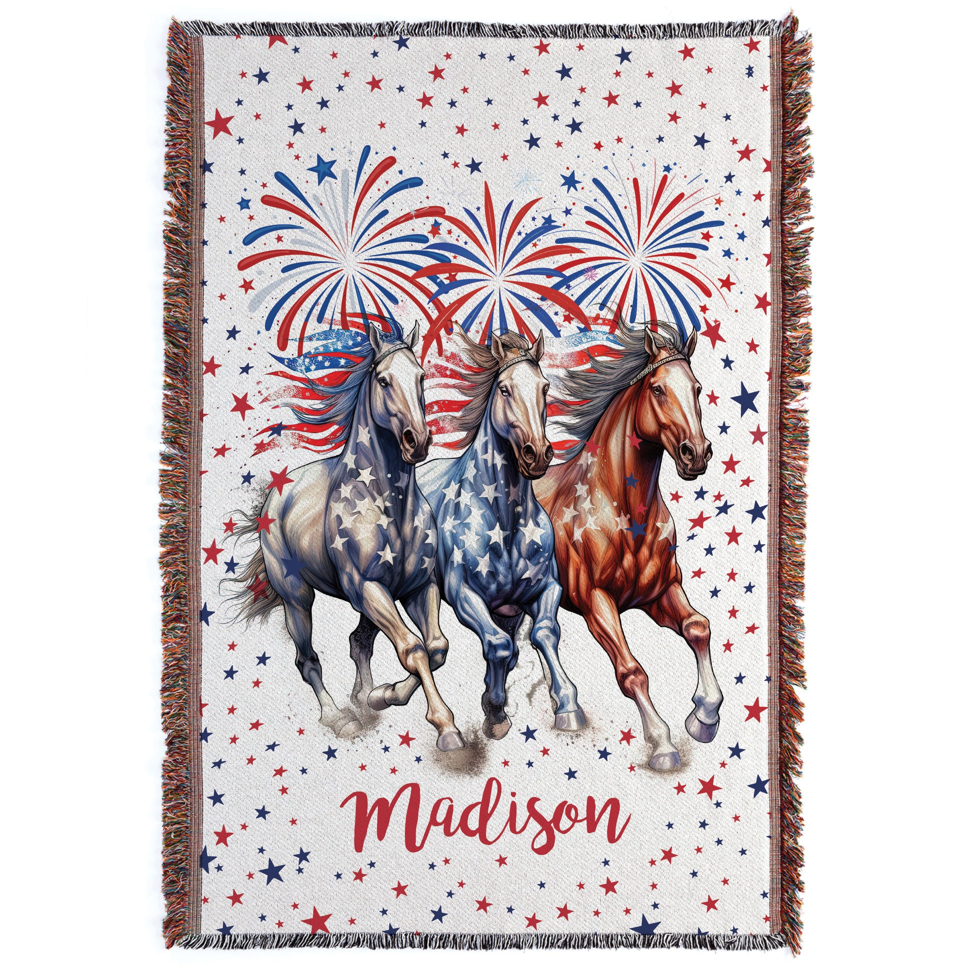 Celebrate the spirit of unity, freedom, and the love of the ride with the United We Ride Horse Fringe Throw Blanket. This patriotic throw features powerful horse imagery paired with classic red, white, and blue American flag design elements-creating a statement piece for equestrian and Americana-inspired homes.