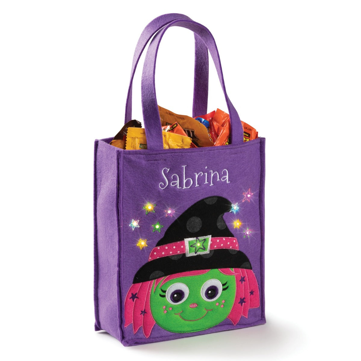 Treat the trick-or-treater in your life to this fabulous, light-up Halloween bag! Starring a smiling witch with bright-pink hair, this LED felt bag features easy-to-hold handles and dazzling light-up stars for a great Halloween Night out. Cast the perfect spell for your little ghoul when you personalize this sensational design with her name at the top!