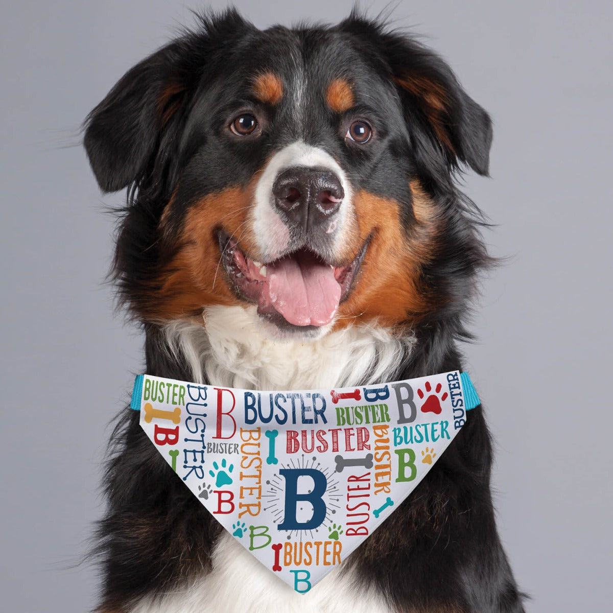 Tie together an unforgettable look for your dashing doggo with this customizable bandana! Showcasing vibrant primary colors, this fun design is filled with paw prints and dog bones and is sure to make your pup stand out. Personalize with an initial and name to create an adorable fashion accessory or unique gift idea for the pet-lover in your life!