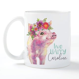 Live Happy Floral Pig Personalized White Coffee Mug - 11 oz.