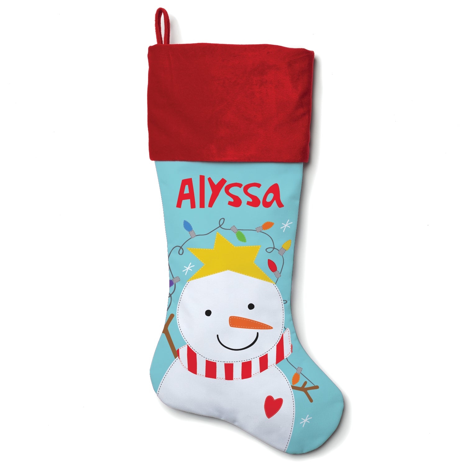This festive design by Sandra Magsamen features a happy snowman with Christmas light accents. We personalize it with any name in red text. Happy Holidays!