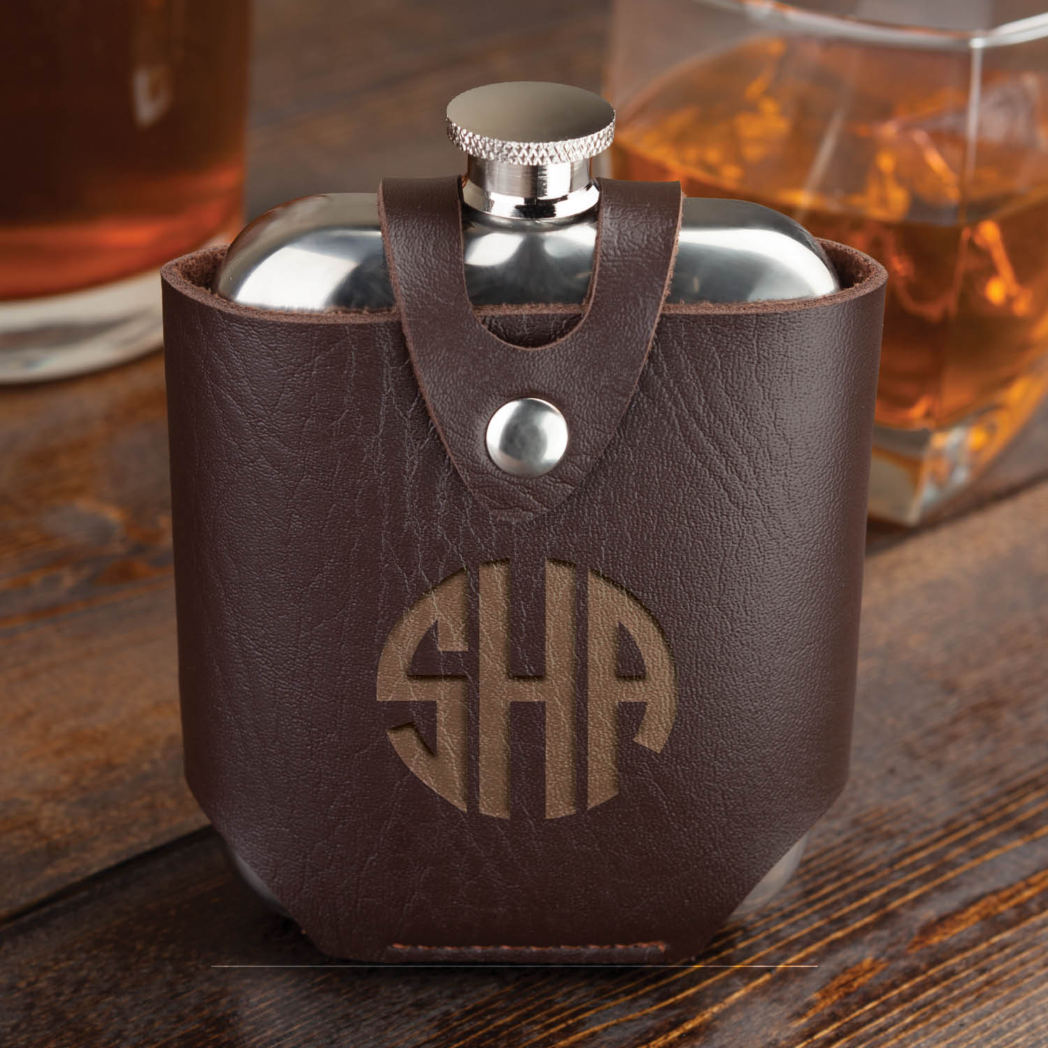 Snap your silver five-ounce flask into a rich chocolate-brown carrying case and set off on the next adventure. Accommodates 5 ounces comfortably. Polished finish on flask with faux leather case. Personalized with a monogram. Order of monogram goes first name, last name and middle name.