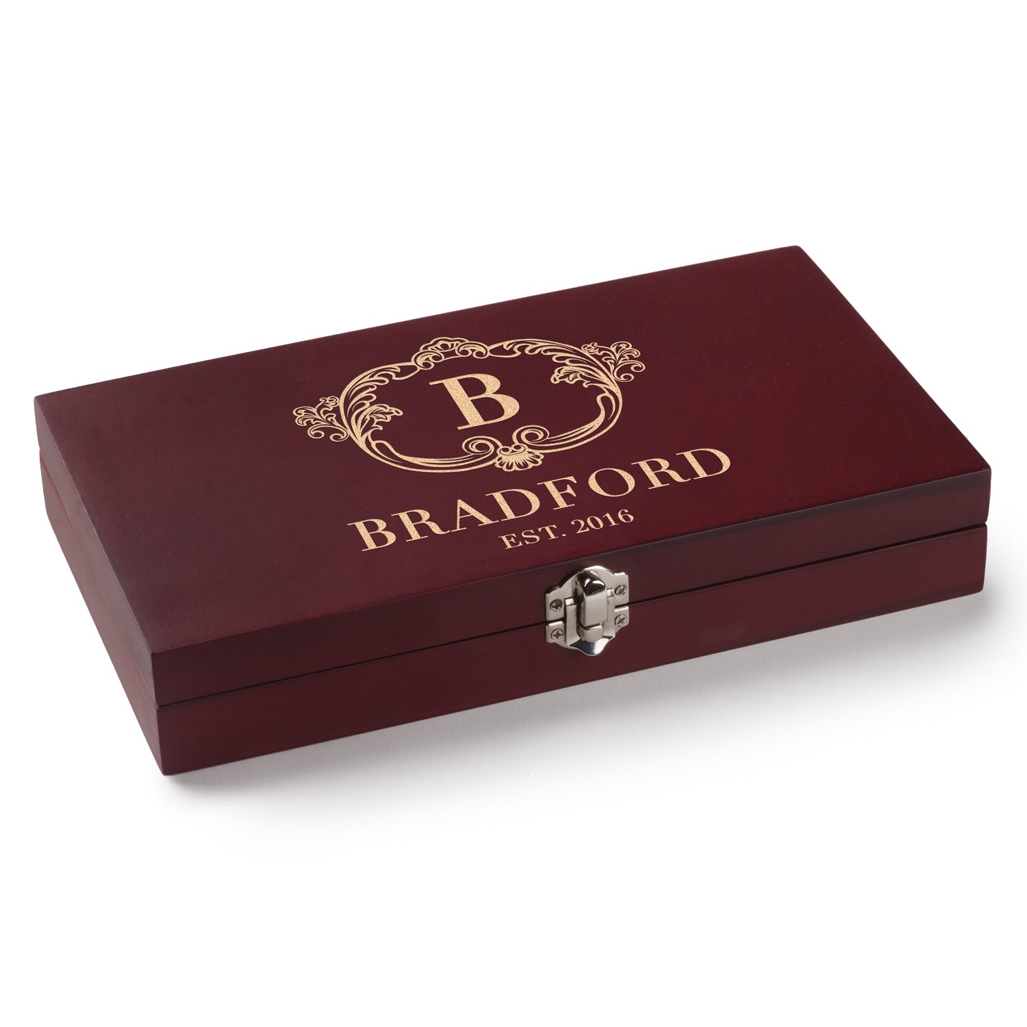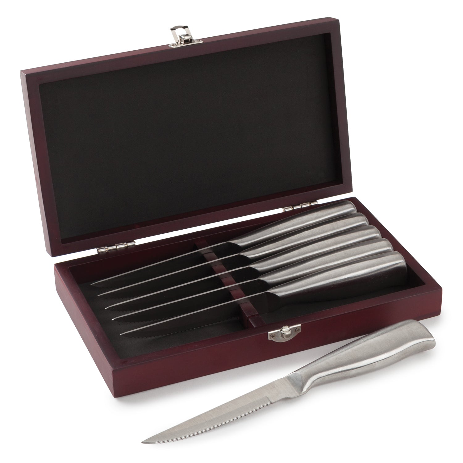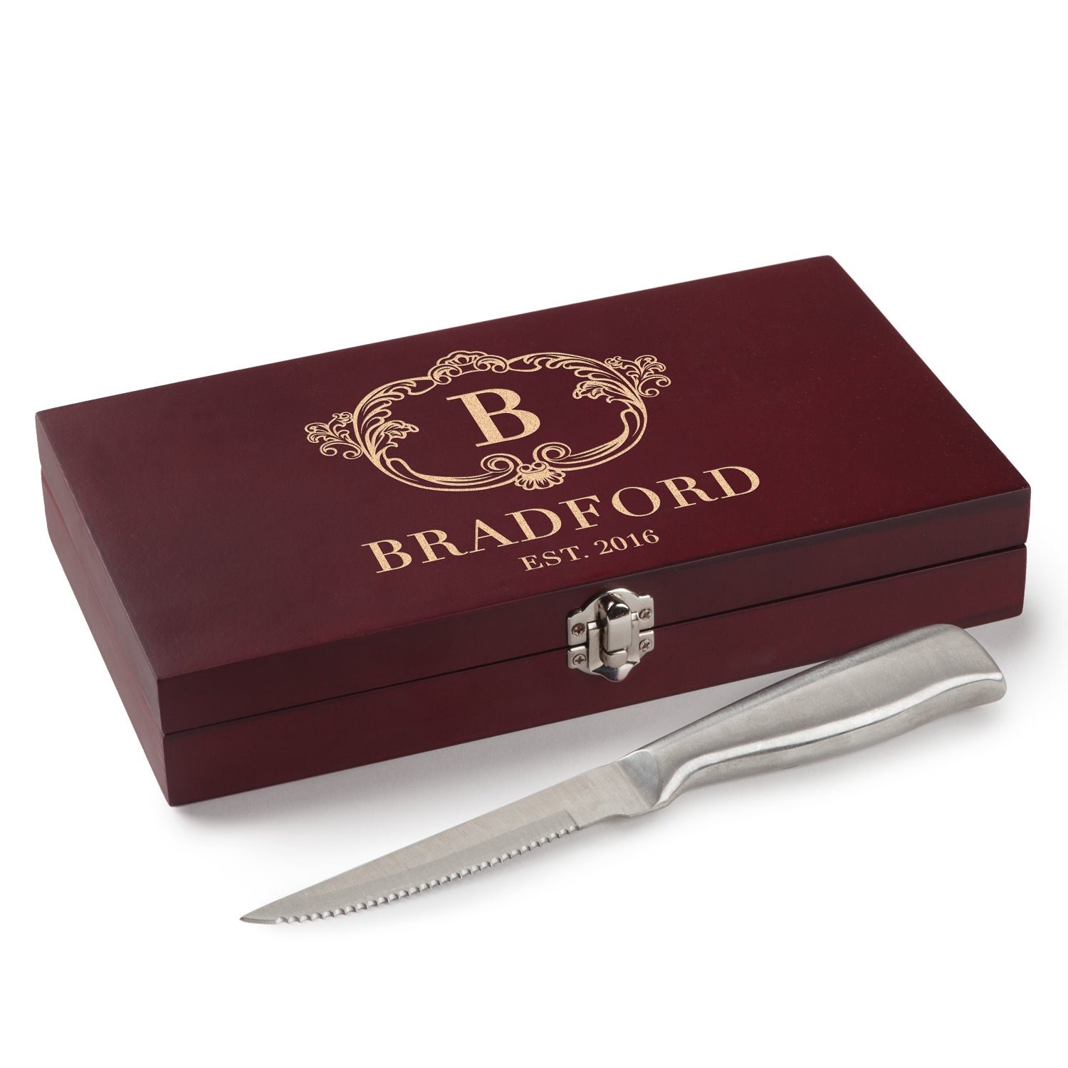 This set includes six stainless steel steak knifes. We personalize the rosewood box by laser engraving an initial, name and optional bottom line of text. Makes a great wedding or housewarming gift.