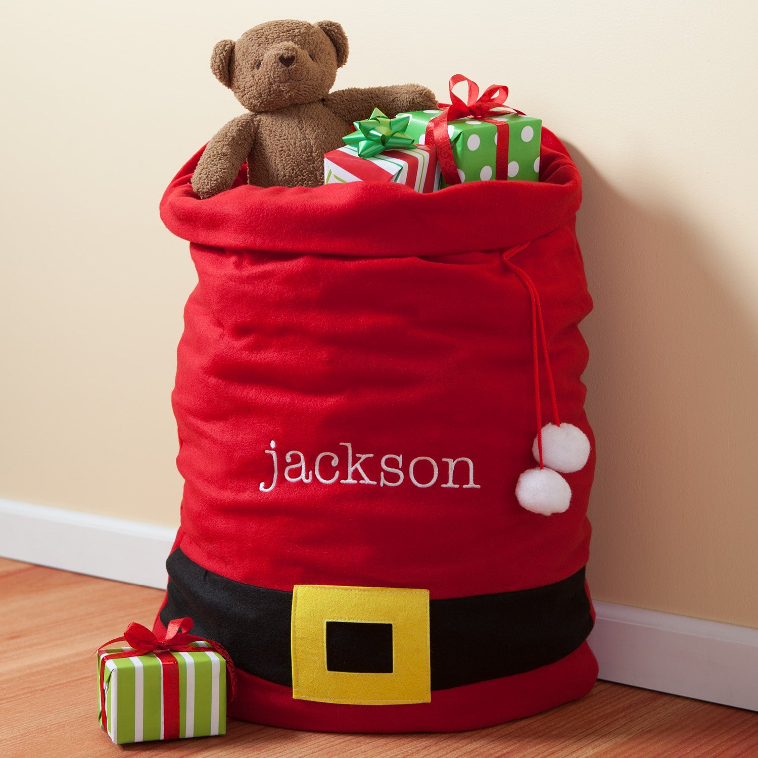 We embroider any name in white thread across the front. Features a drawstring closure with white pom pom accents. Realistic Santa belt with gold buckle. Merry Christmas!