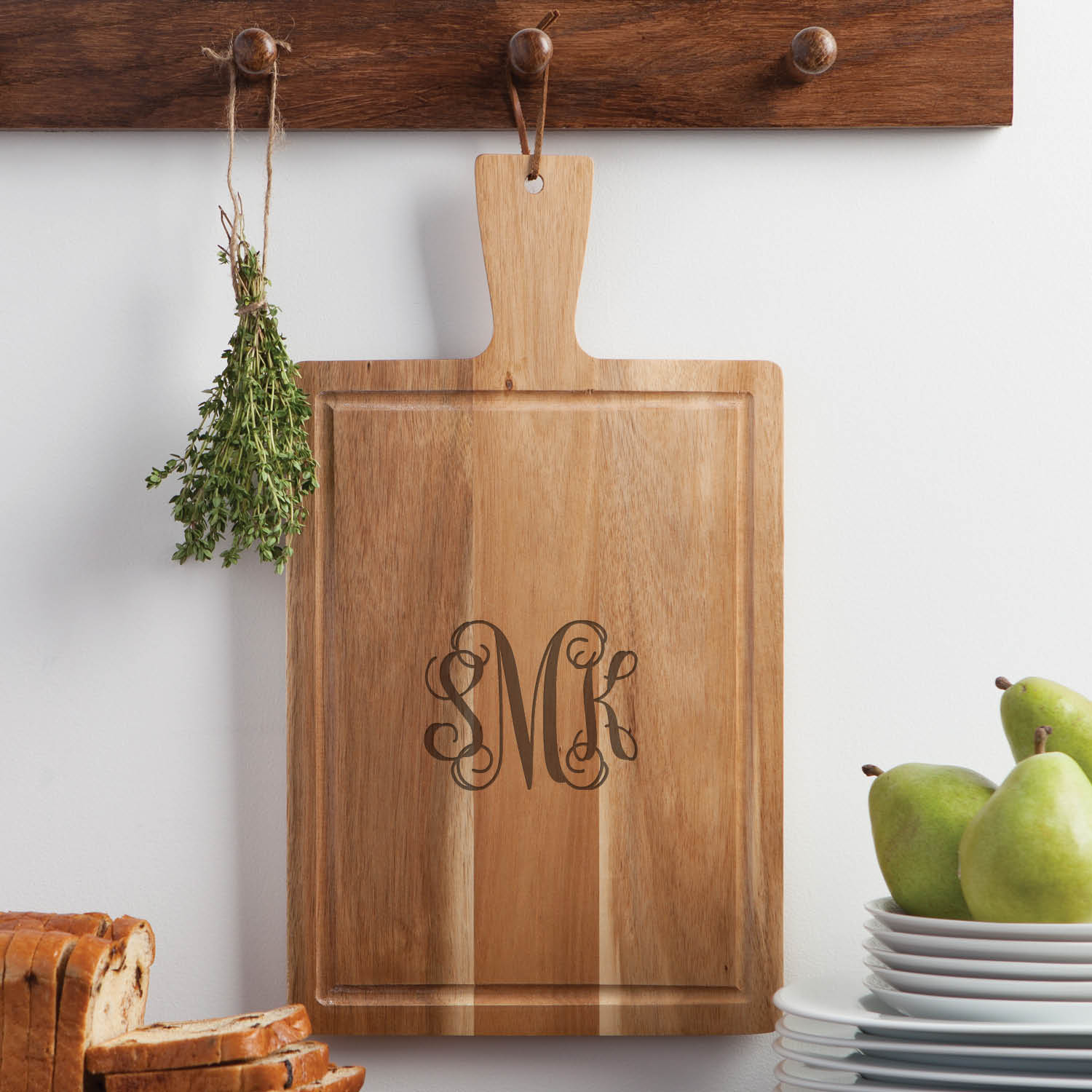 Use this piece as a functional carving board or as a decorative piece. Includes leather strap at the top for hanging. Acacia wood is known for its strength and durability, which makes it the perfect choice for any carving board. Personalize with any monogram on the center of the board. If for a married couple the order would be his first name initial, last name initial and her first initial
