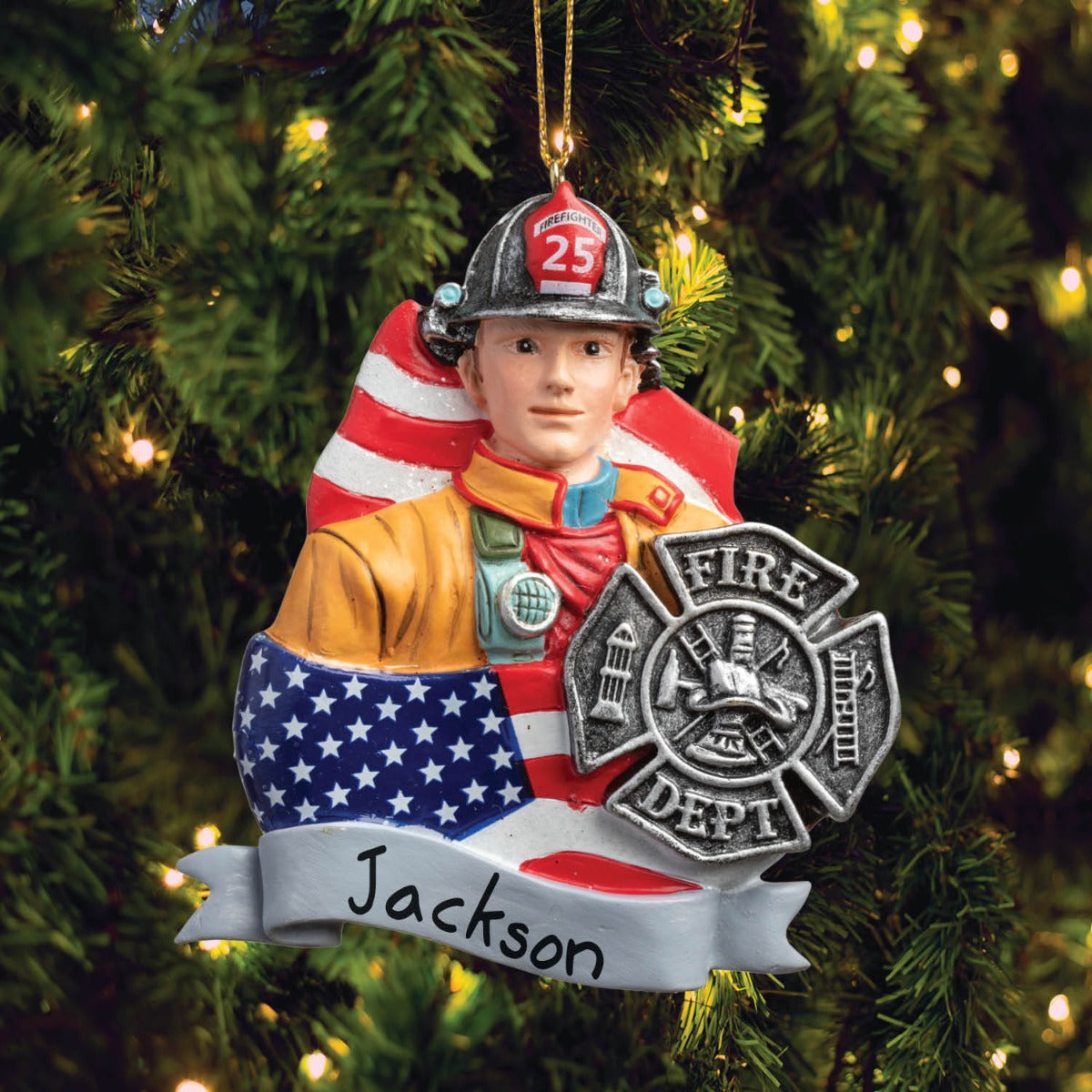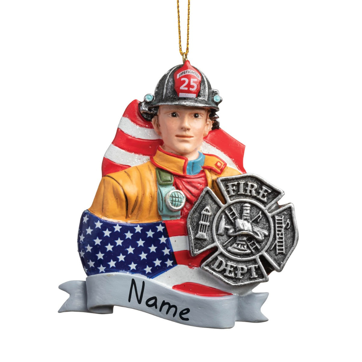 Fireman With Badge & American Flag Personalized Ornament