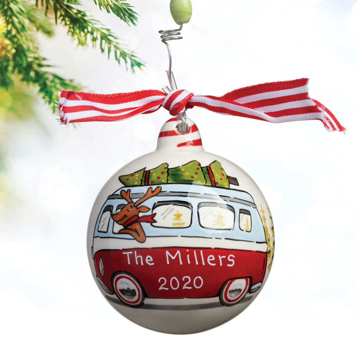 Hop on in for a different kind of reindeer ride with this unique design! Starring a big, red bus driven by a scarfed reindeer, this hand-painted ornament features space to personalize with a family name, special message, or any desired text on the bus's side. Makes a wonderful addition to your holiday decorations or an unexpected gift for the joyful family in your life when you personalize!