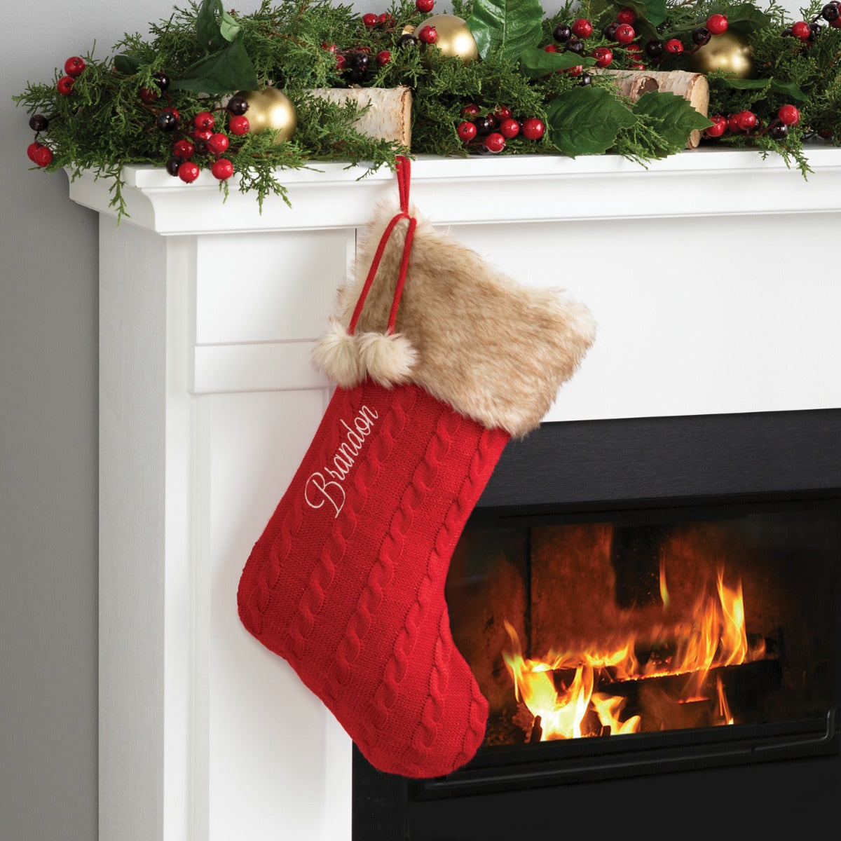 Craft a dazzling scene for your home this holiday season with customized decor! Chic and unique, this red knit stocking showcases a faux-fur cuff and dangling puffball for a standout look to absolutely love. Personalize along the side with an elegantly embroidered name to make this sensational stocking one-of-a-kind!