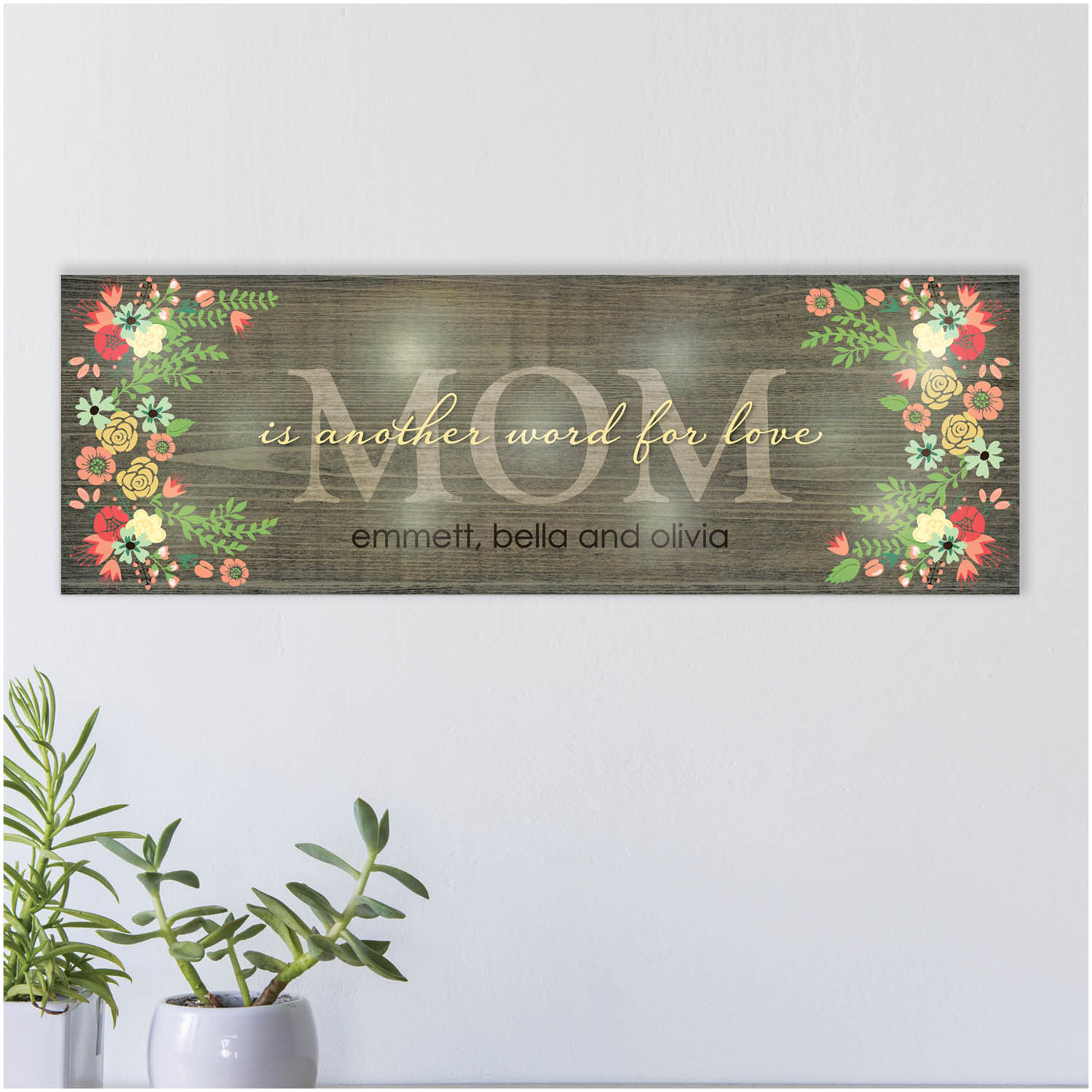 Our exclusive canvas features the phrase "Is Another Word For Love". We add any title you choose that will appear within the phrase. Choose Mother, Mom, Grandma, Nana, etc. We then top it off by adding one line of text at the bottom. The LED lights in the background make it extra special.