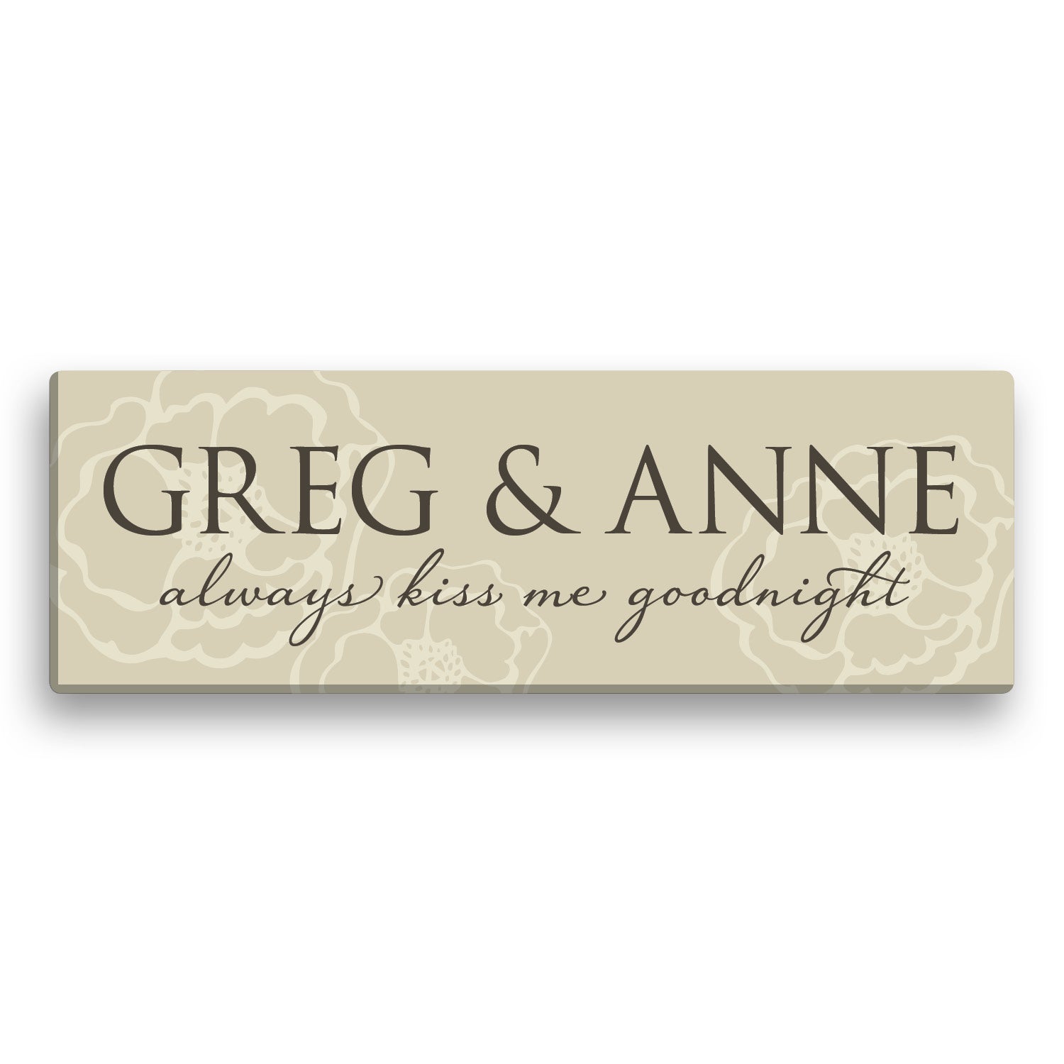This wall canvas features a special message, "Always Kiss Me Goodnight". Create the perfect canvas for the perfect couple when you add a line of personalization.