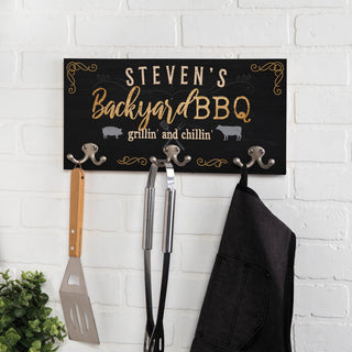 Store your BBQ tools in style with this clever utensil hanger! Wood design includes hooks for hanging a spatula, tongs and other grilling essemtials. Personalize to create a handy addition to your deck or patio or give as a gift to your favorite grillmaster. Personalization will appear in all UPPERCASE letters.