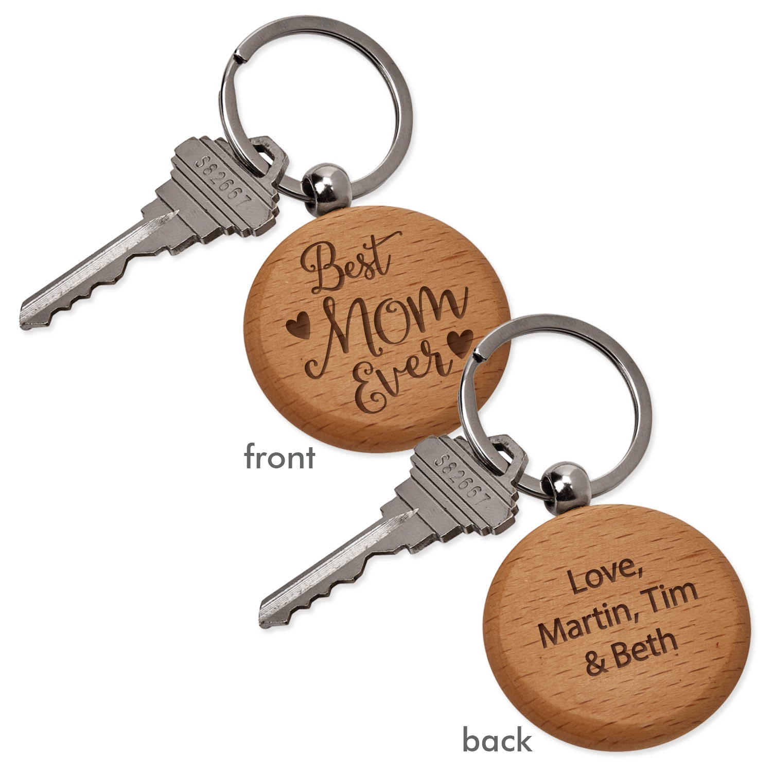 Our personalized key chain features a wood circle that is laser engraved with the phrase "Best Mom Ever" on one side and up to 3 lines of text on the opposite side. The overall measurement is 3.25 inches.