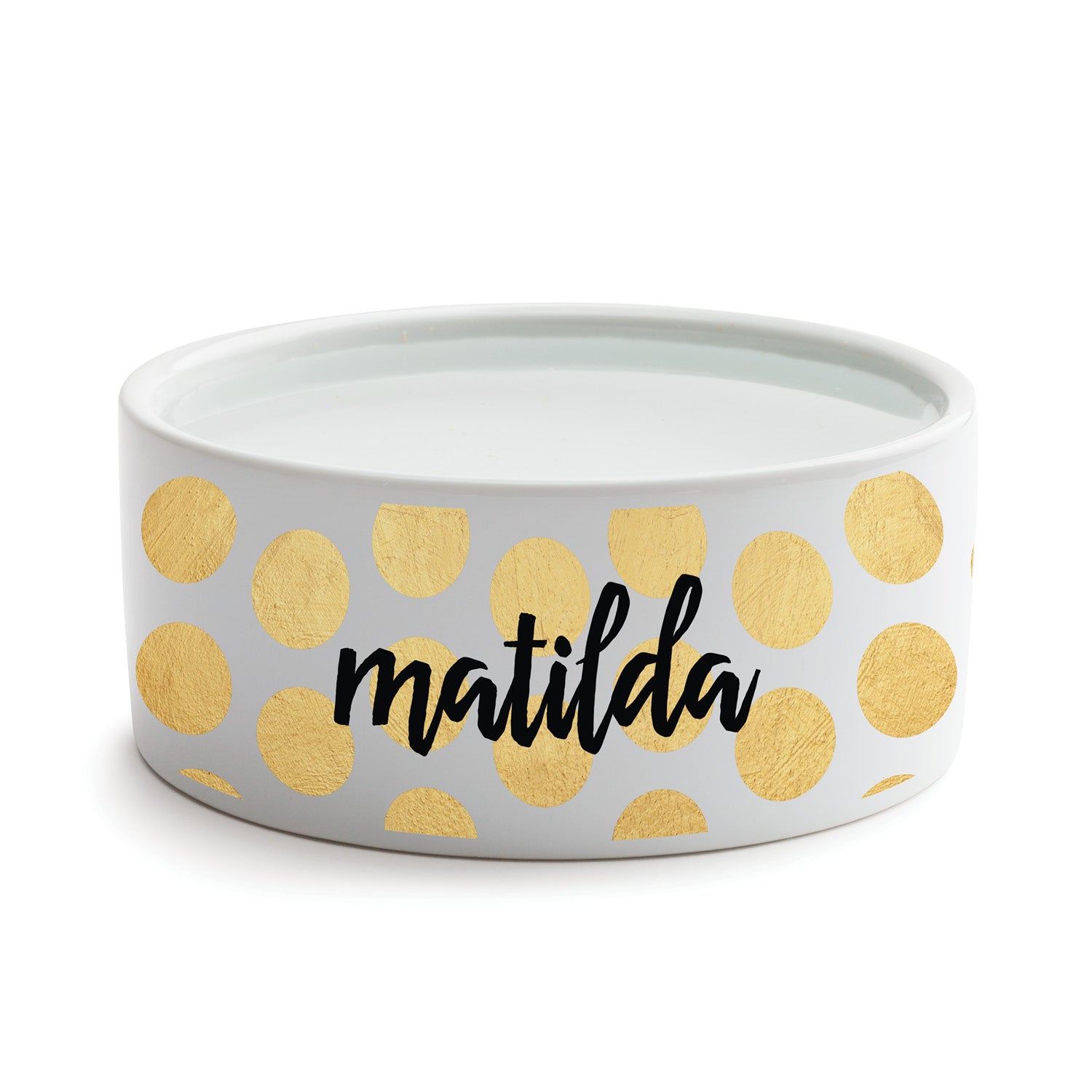 Our exclusive design features stylish gold polka dots and your pet's name proudly displayed in black text. Perfect for their food or water.